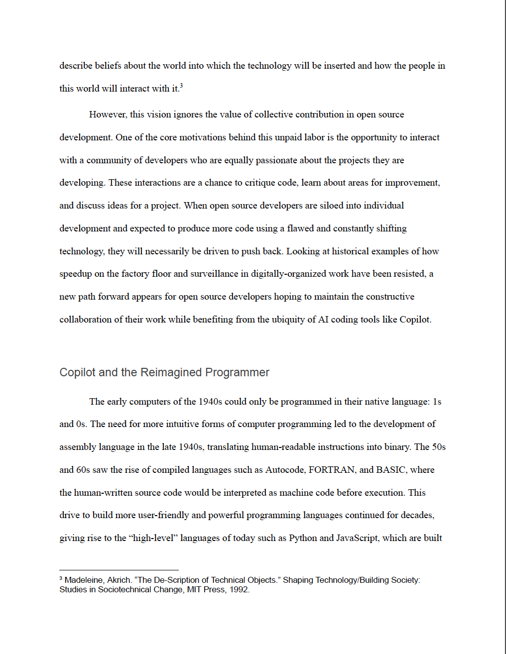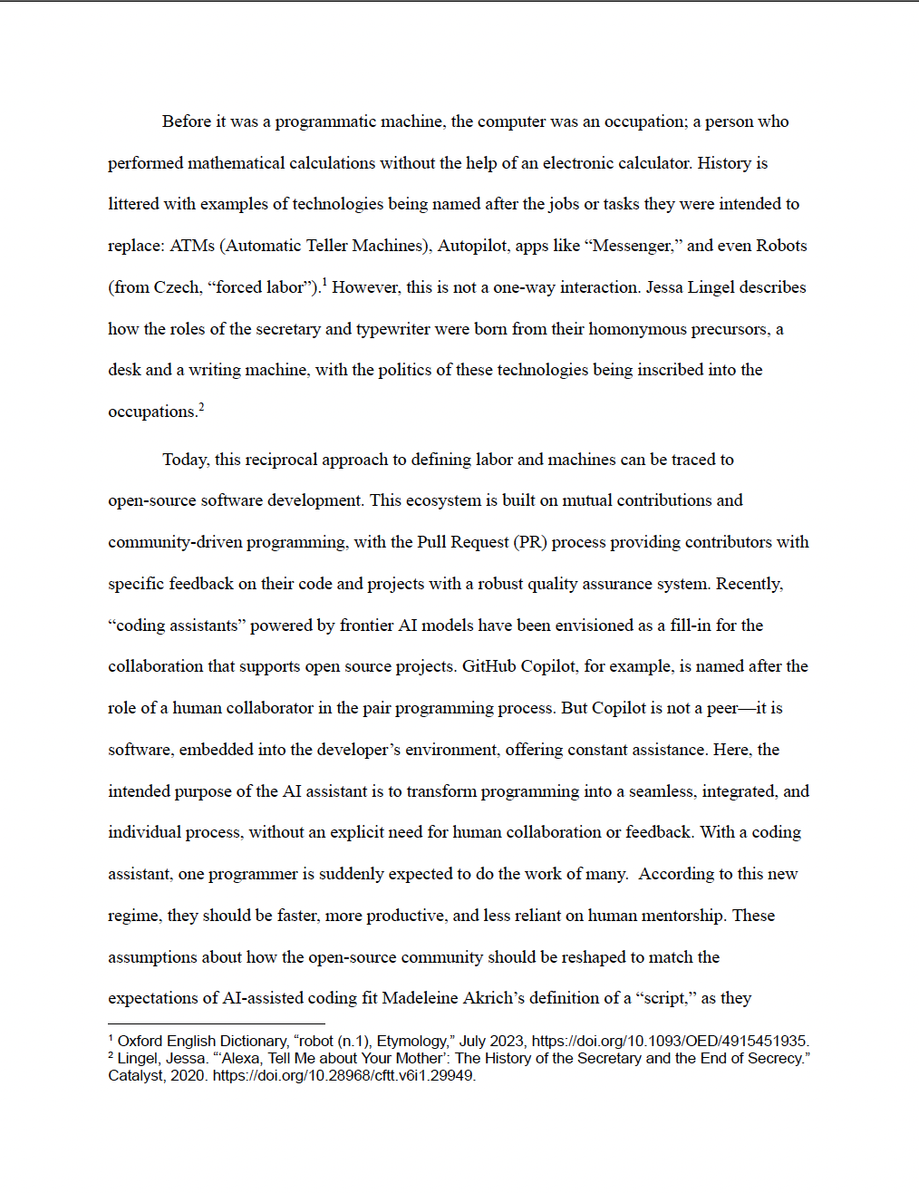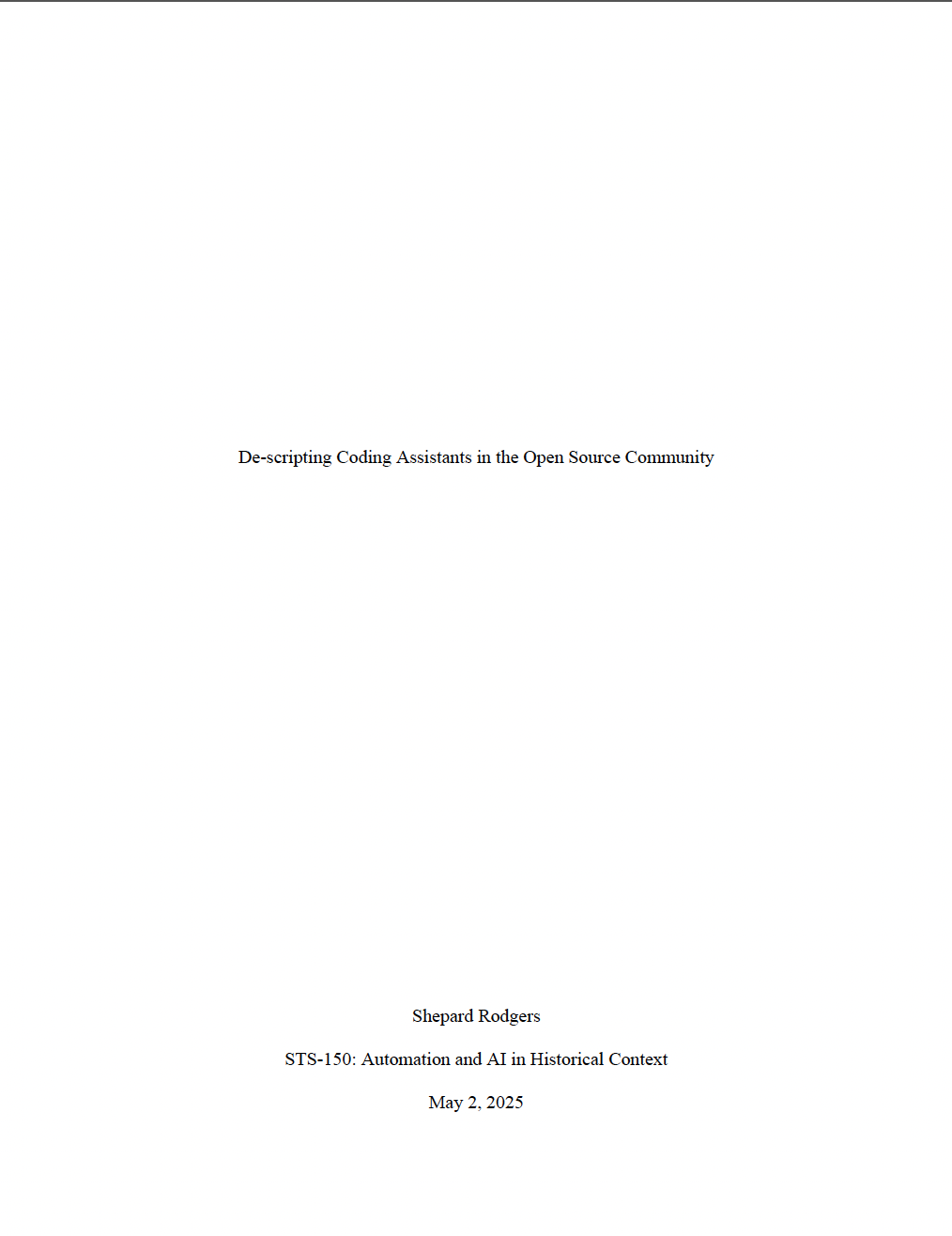 A recent report of mine, which draws on the history of automation and STS literature to envision an alternative future for open-source developers in a world where ubiquitous AI coding assistants force a reconception of their incentive structures and professional values.
